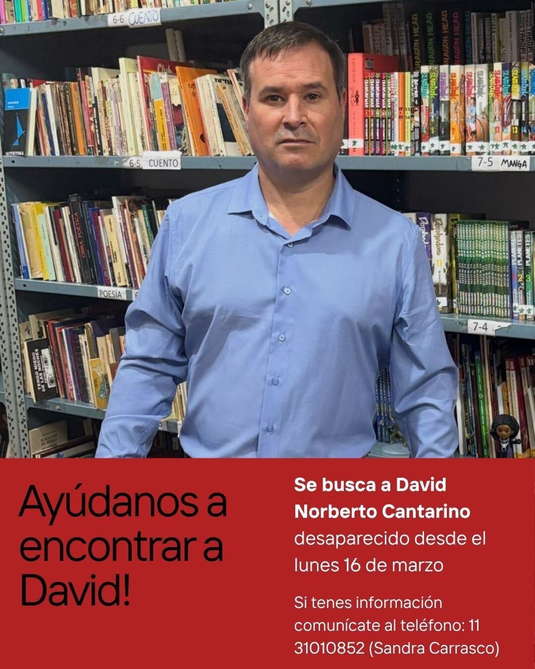 DESAPARECIDODESAPARECIDO EL 16 DE MARZO 👇 Buscan a David Norberto Cantarino: fue visto por última vez hace una semana. La esposa del militante político radicó la denuncia e inició una campaña para dar con su paradero, tras la desaparición el pasado lunes 16.