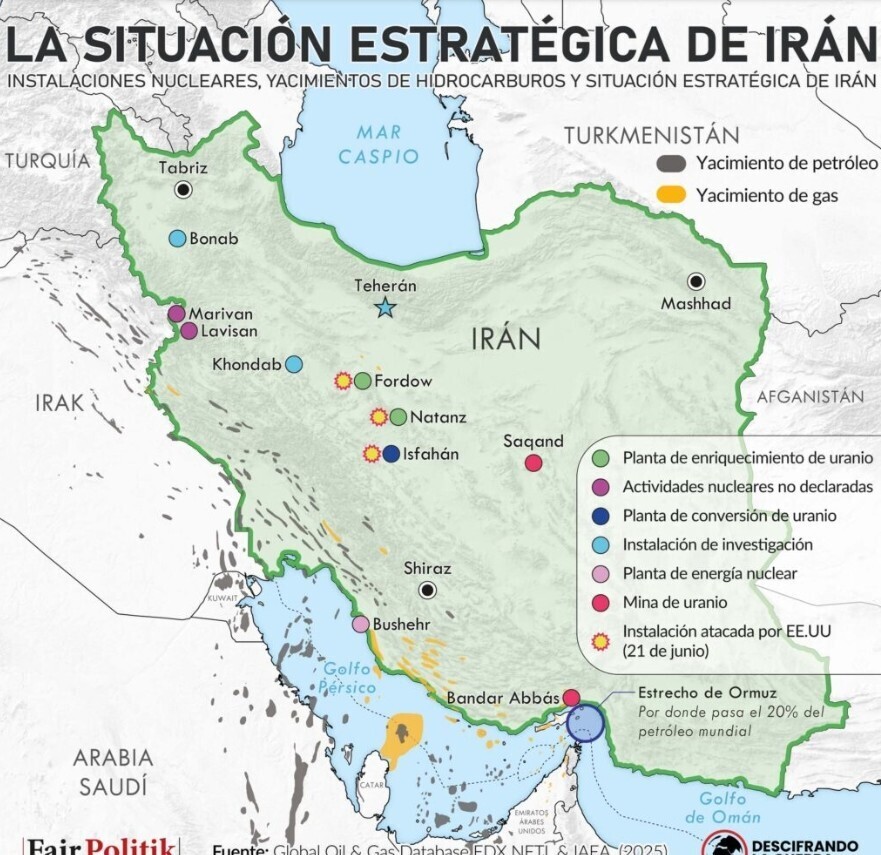 La guerra entre Usa/Israel vs. IránMapa de las instalaciones nucleares, los principales yacimientos de hidrocarburos y la posición estratégica de Irán, así como de las infraestructuras nucleares atacadas por Estados Unidos durante la Guerra de los Doce Días.